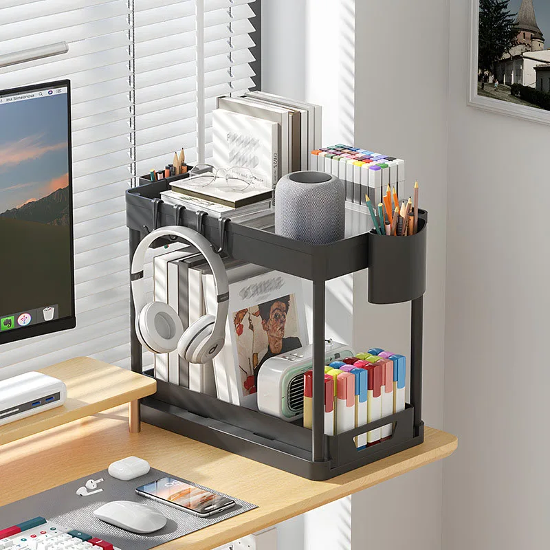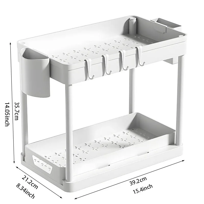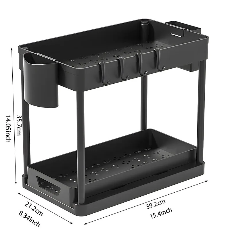 This under sink organizer is designed with a double layer, maximizing the use of vertical space.Comes with 4 side hooks for hanging some small items, effectively using the limited space.